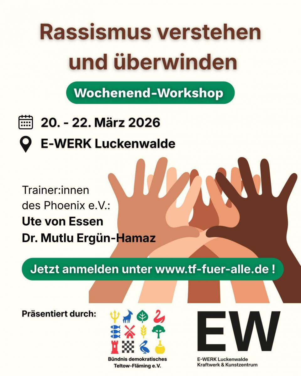 E-WERK Luckenwalde and the Bündnis Demokratisches Teltow-Fläming e.V. invite you to an intensive Critical Whiteness Workshop by Phönix e.V. in Luckenwalde from March 20–22, 2026. Phönix e.V., awarded the Aachen Peace Prize, is one of Germany’s oldest and most active anti-racism organizations. The training is designed for white participants and provides space to reflect on systemic and unconscious racism in society and personal experience. It provides a clear and supportive framework for addressing systemic and unconscious racism in our country, culture and personal histories. Ultimately, the training asks: 'How can I effectively combat racism?' Together, we will explore initial steps and possibilities. One of the two trainers grew up in Luckenwalde. Led by Ute von Essen and Dr. Mutlu Ergün-Hamaz, it combines scientific insight with many years of practical experience. Participation requires a binding registration, limited to 20 places.